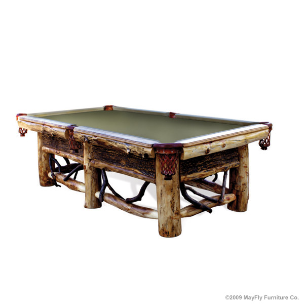 Make a statement with one of our finely crafted rustic pool tables. Our log and timber pool tables compliment any mountain home. We use only the best materials in building our tables. From pressure treated laminated wood for the frame/cabinet, ensuring strength. To our 3 piece, 1 inch, Italian/Brazilian slate. Which is finished with tournament grade cushions, felt and pockets. Once your rustic pool table is in place, complete your game room with a log poker table or dartboard.
